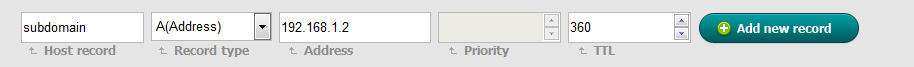 2. Khai báo tên miền con subdomain.examle.com trỏ về IP 192.168.1.2. Sử dụng bản ghi A:
