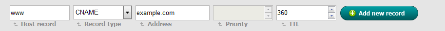 3. Khai báo tên miền con www.example.com là alias của tên miền example.com. Sử dụng bản ghi CNAME: