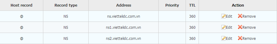 Lưu ý: Khi tên miền được khởi tạo, có 3 bản ghi NS mặc định được tạo, đây là các bản ghi định danh máy chủ DNS của Viettel IDC sẽ quản lý tên miền này. Quý khách lưu ý không xóa hoặc chỉnh sửa nội dung 3 bản ghi này: